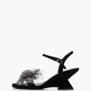 Sandale negre, piele intoarsa, accesoriu floral